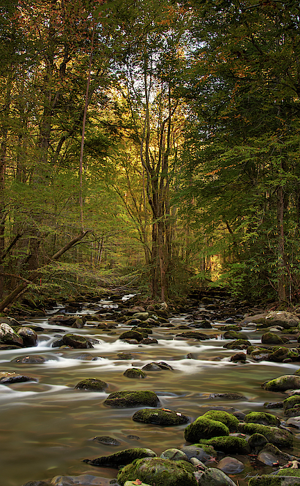 A fading afternoon sun illuminates the trees above this shady river in Greenbriar.